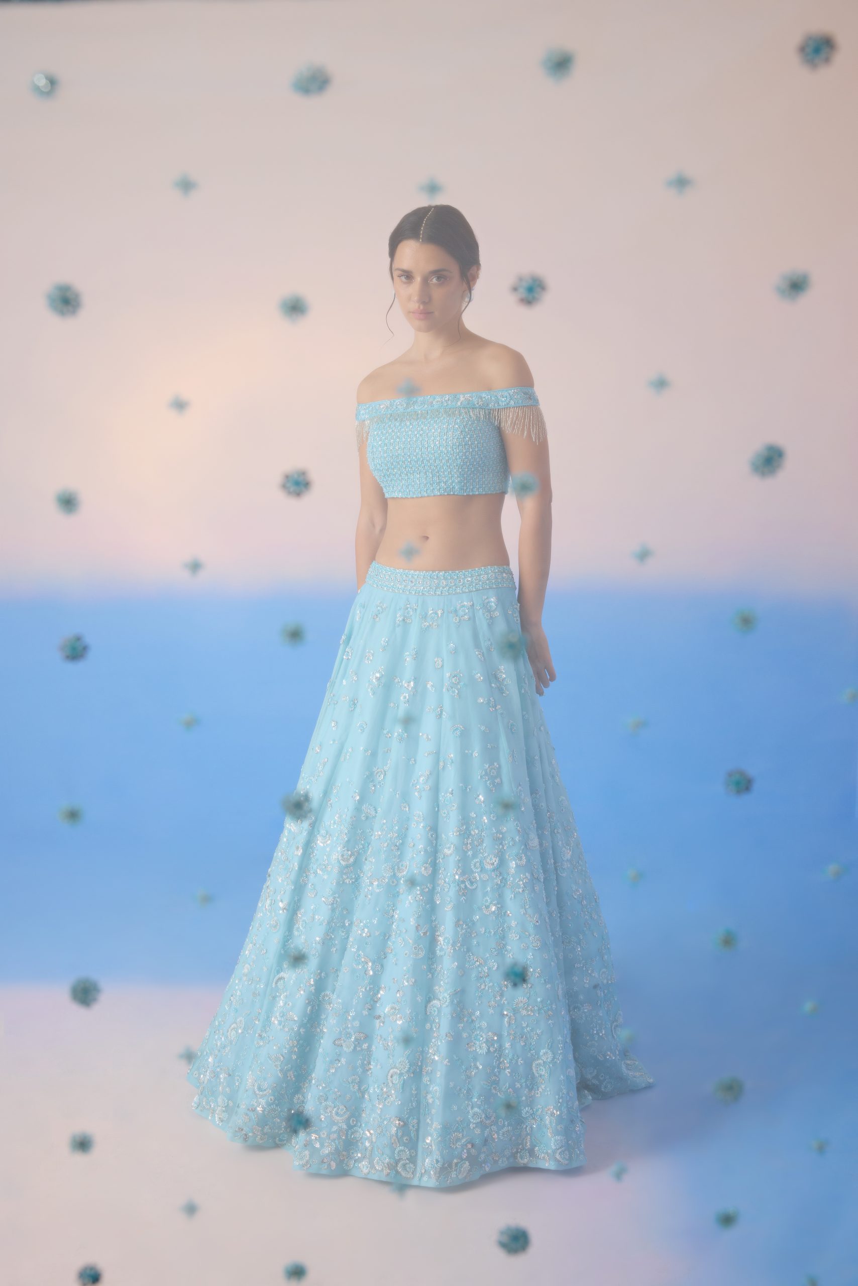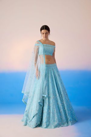 OFF SHOULDE HEAVY EMBROIDERED BLOUSE AND LEHENGA WITH DUPATTA